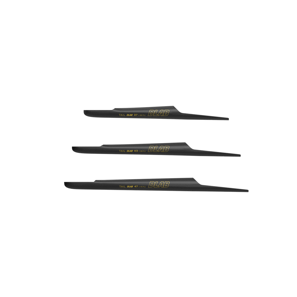 Die D/LAB-Tails sind in drei Längen erhältlich. Ein kürzeres Stück von 37 cm, das in Verbindung mit einem Frontwing dem 60 cm Fuselage entspricht, ein 43 cm Tail, das der 66 cm Fuselage entspricht, und ein 47 cm Tail, das zur 70 cm Fuselage passt.